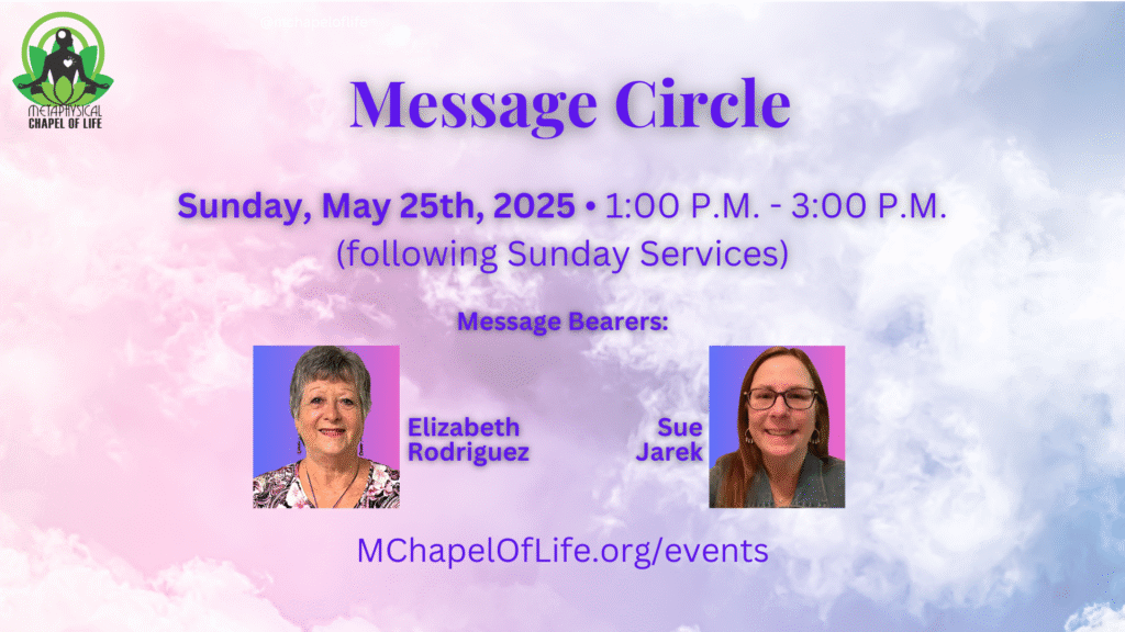 Event: Message Circle (In-Person) Location: Metaphysical Chapel of Life • 9314 Warwick Blvd., Newport News, VA 23601 Date: Sunday, May 25th, 2025 Time: 1:00 P.M. – 3:00 P.M. (following Sunday Services) No cost for this event • Donations always welcome