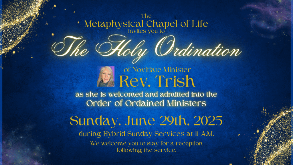On Sunday, June 29th, 2025, Rev. Trish — currently serving as a Novitiate Minister—will be fully ordained and welcomed into the Order of Ordained Ministers at the Metaphysical Chapel of Life and the Church of Enlightenment.