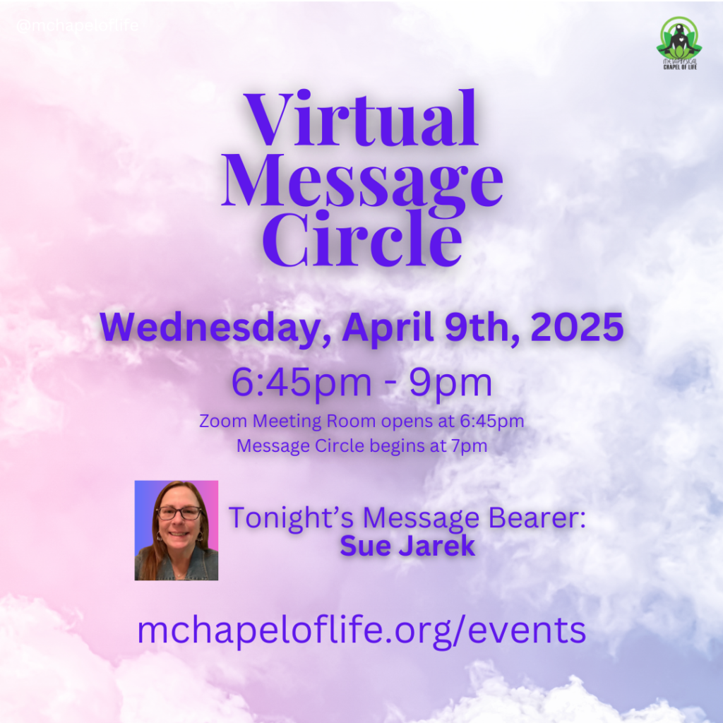 Event: Virtual Message Circle Location: Online Only (Zoom) •• How to Join Our Online MeetingsDate: Wednesday, April 9th, 2025 Time: 6:45 P.M. – 9 P.M. (Please log in no later than 7 P.M.)